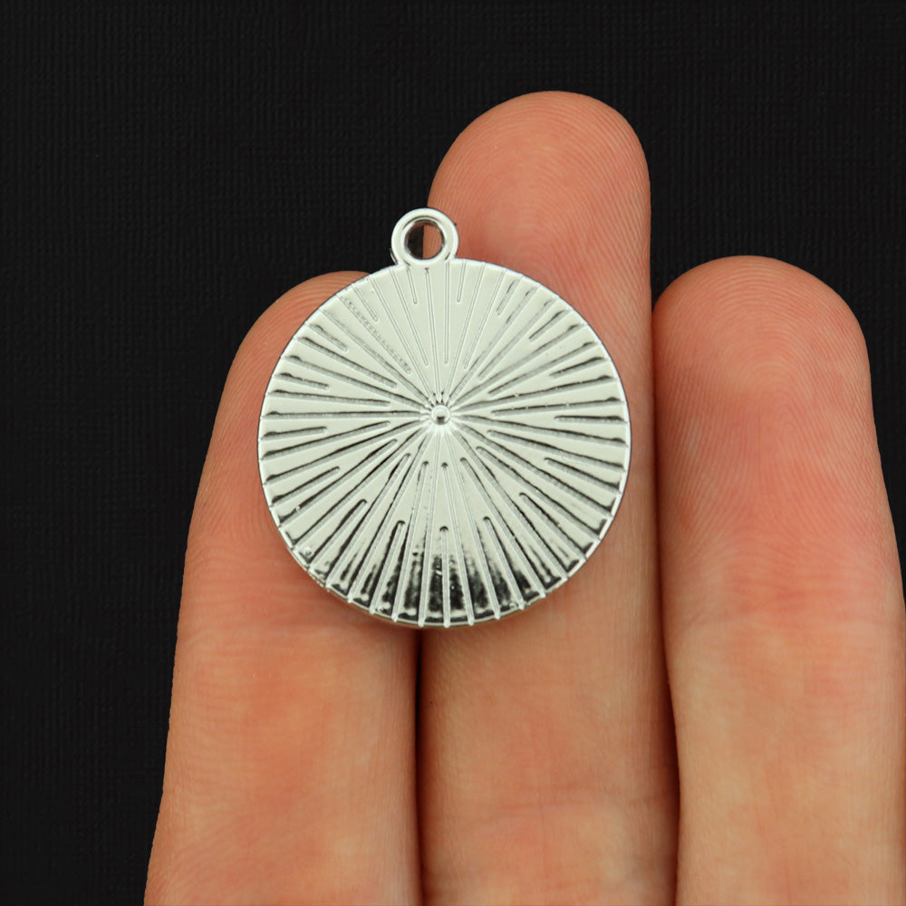 Black mountains and river design with moon and tent silver tone charms, in a zinc alloy metal and enamel.
