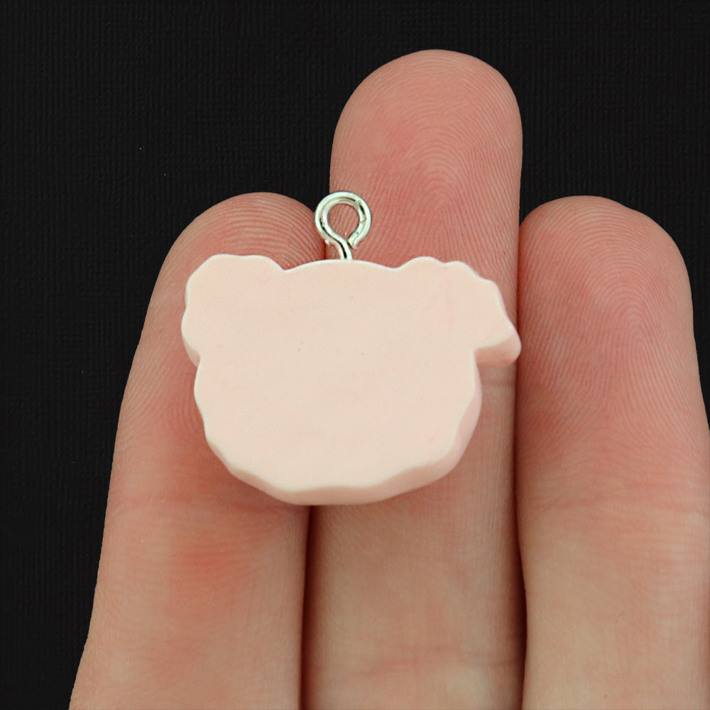 Pink pig head charms with a silver tone alloy loop, in resin.