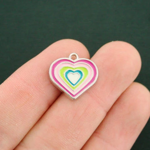 Rainbow heart silver tone charms, in a zinc alloy metal and enamel.