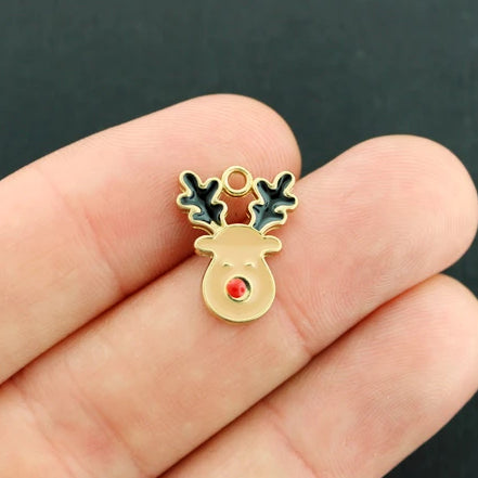 Reindeer gold tone charms, in a zinc alloy metal and enamel.