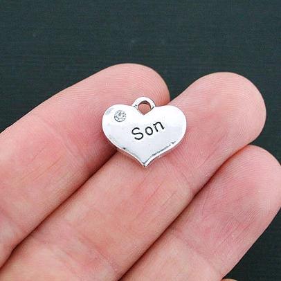 "Son" heart antique silver tone charms with inset clear rhinestones, in a zinc alloy metal.