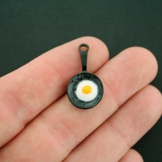 Fried egg in pan charms, in a zinc alloy metal and enamel.