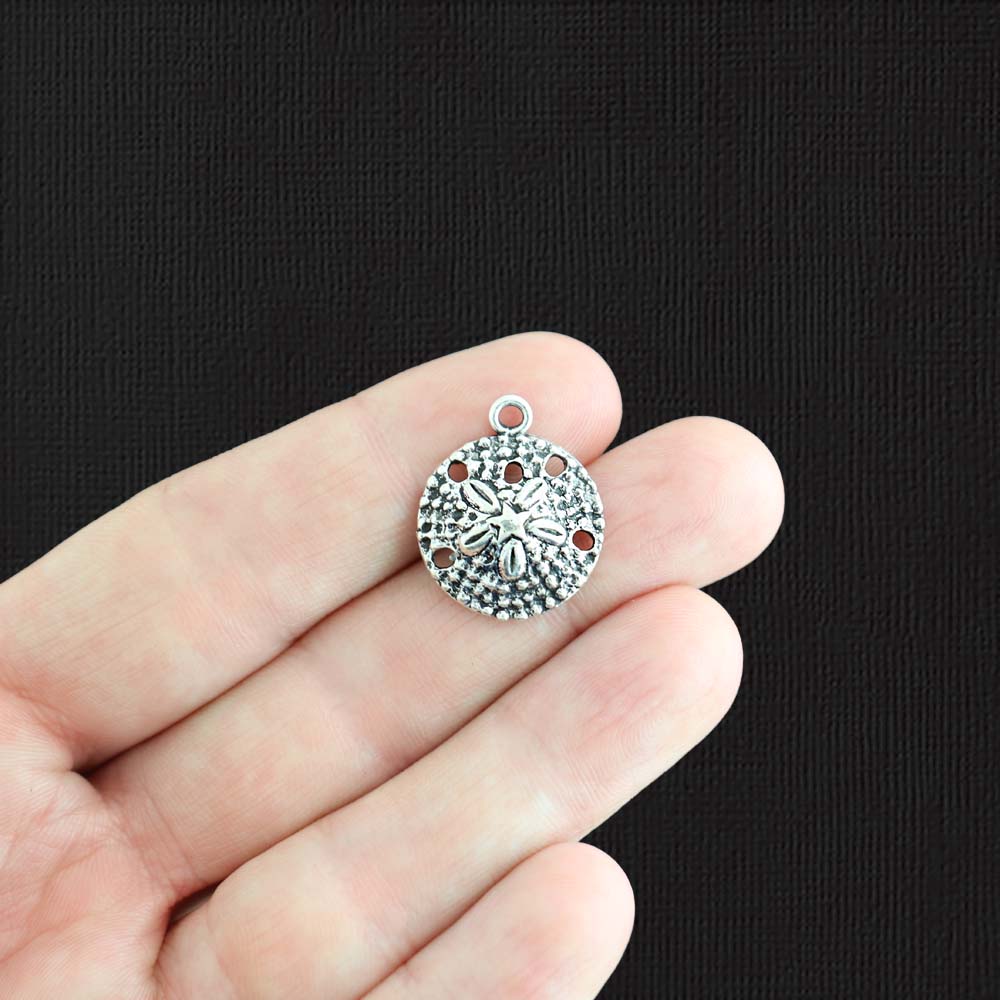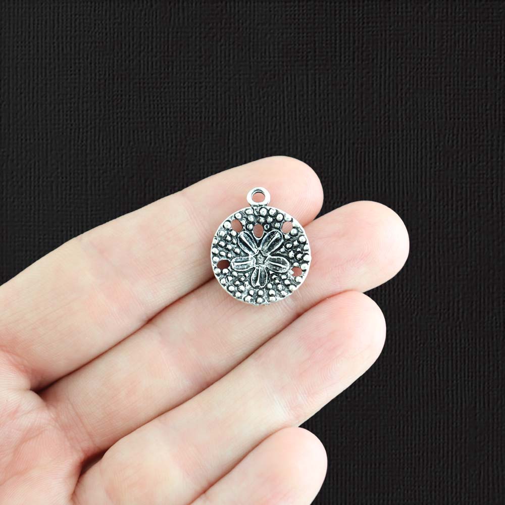 Sand dollar antique silver tone charms, in a zinc alloy metal.