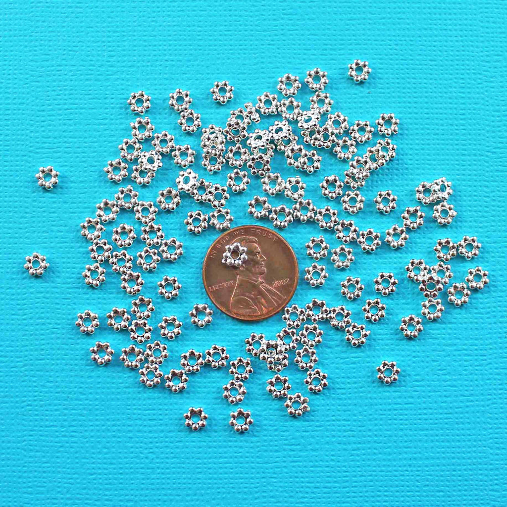 Silver tone zinc alloy metal beads in a 5mm spacer, with a metallic finish.