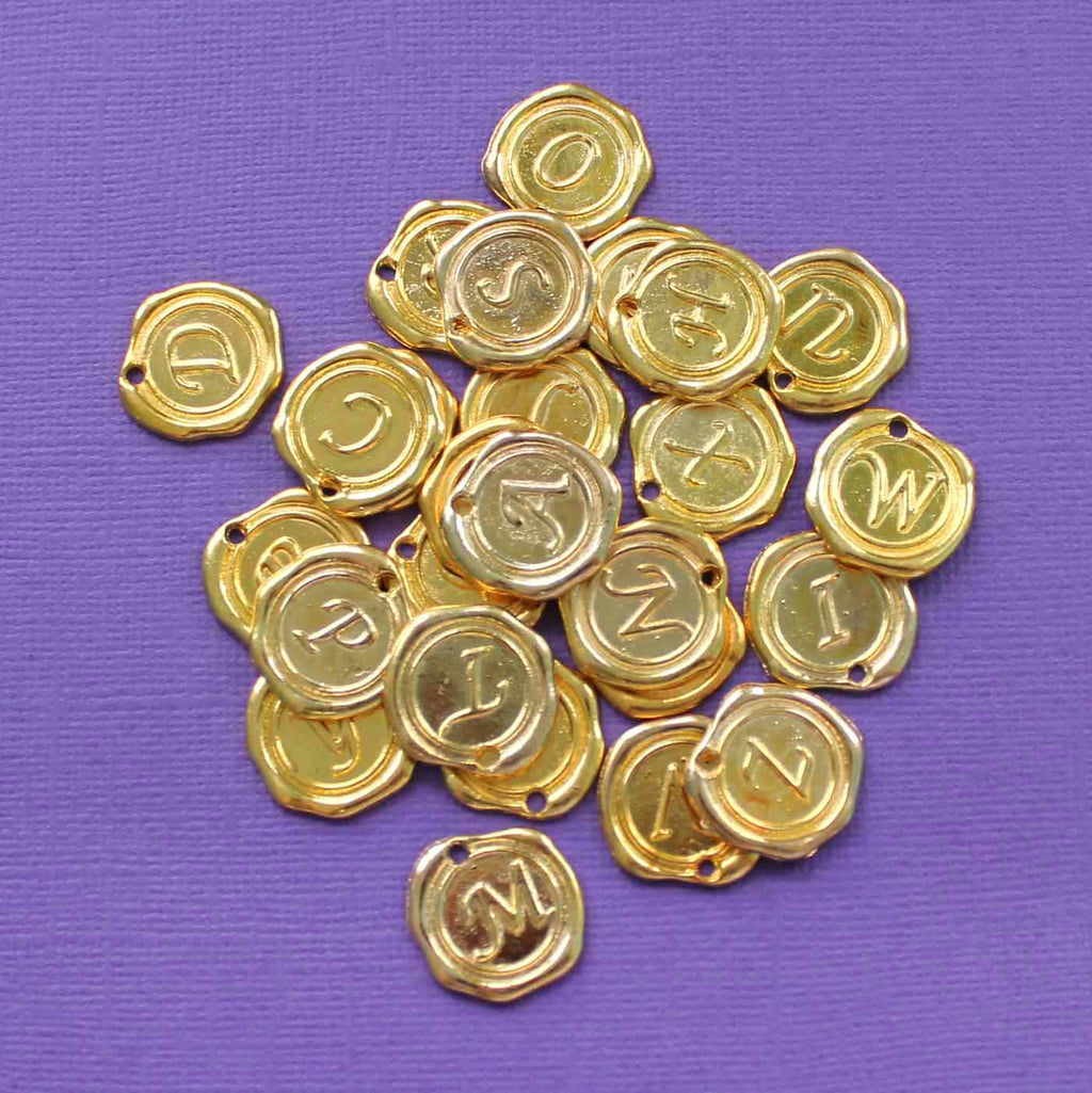Alphabet letter wax seal design antique gold tone charms, in a zinc alloy metal.