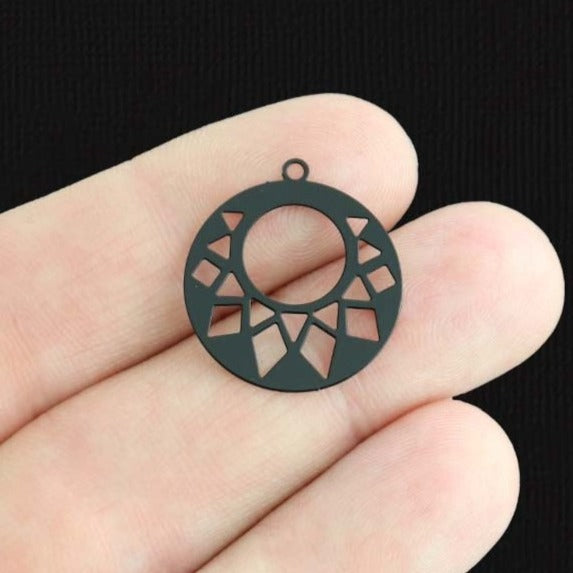 Geometric round charms, in iron alloy and enamel.