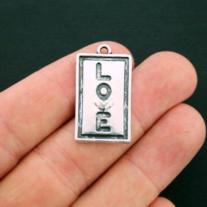 "Love" tag antique silver tone charms, in a zinc alloy metal.