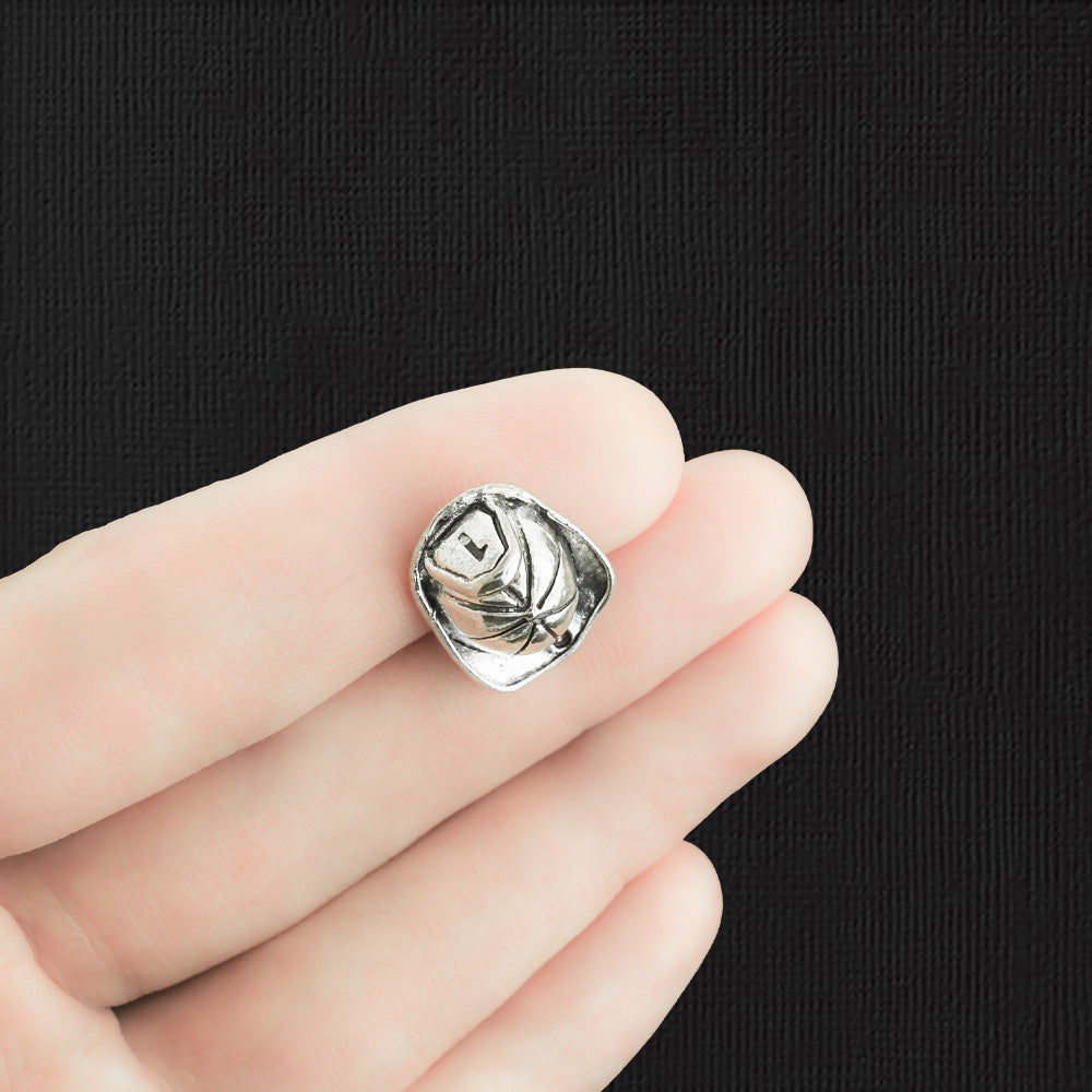 Fireman helmet antique silver tone charms with inset clear rhinestones, in a zinc alloy metal.