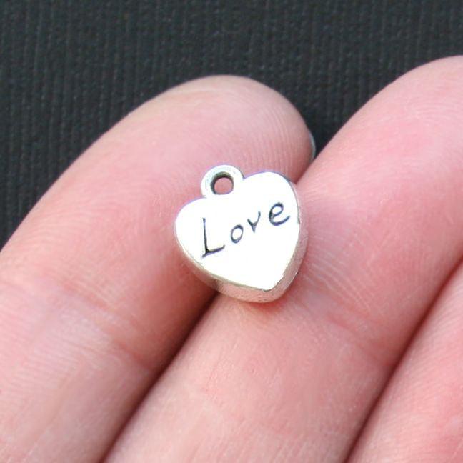 Heart with engraved love antique silver tone charms, in a zinc alloy metal.