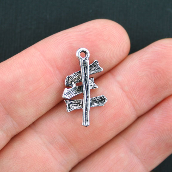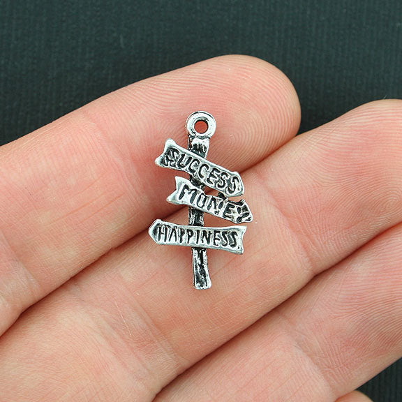 "Success, Money, Happiness" arrow signpost antique silver tone charms, in a zinc alloy metal.