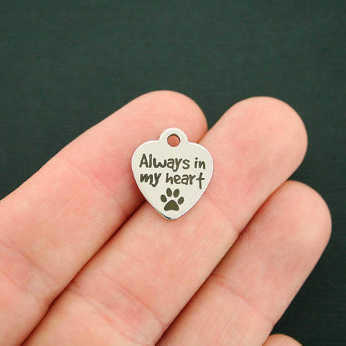 "Always in my Heart" laser engraved stainless steel heart charms with paw print image, from our exclusive line designed by Bohemian Findings.