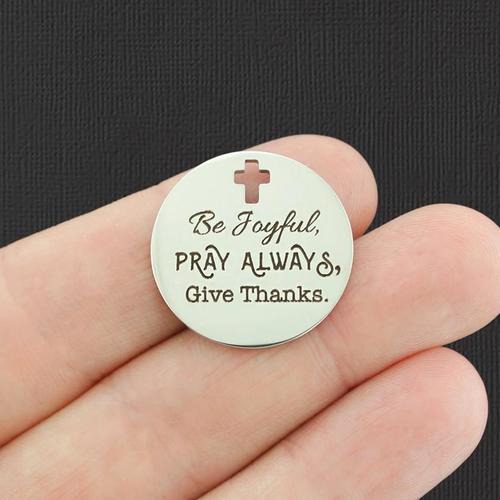 "Be joyful, pray always, give thanks" laser engraved stainless steel cross cutout round charms, from our exclusive line designed by Bohemian Findings.