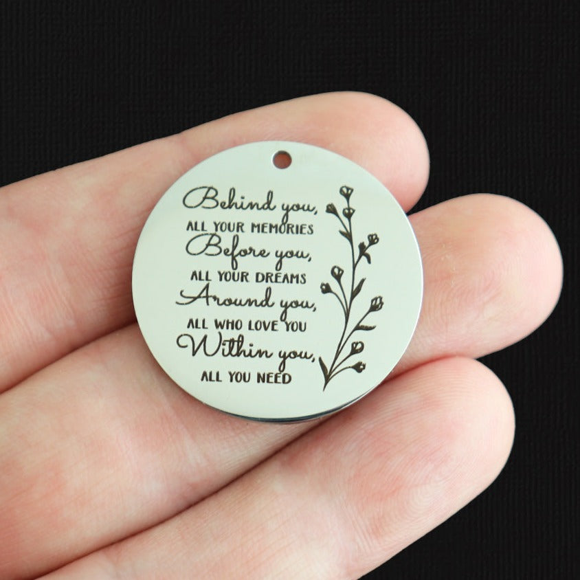 "Behind you, all your memories. Before you, all your dreams. Around you, all who love you. Within you, all you need" laser engraved stainless steel round charms with flower vine image, from our exclusive line designed by Bohemian Findings.