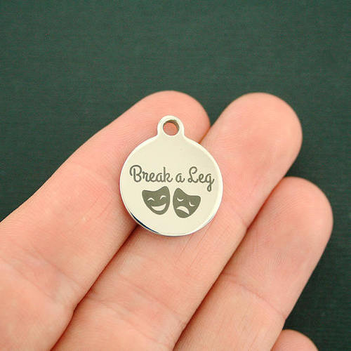 "Break a leg" laser engraved stainless steel round charms with comedy and tragedy mask images, from our exclusive line designed by Bohemian Findings.