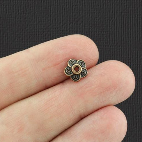 Bronze tone bead caps with a flower swirl design in a zinc alloy, to add some dazzle to your next beaded creation!