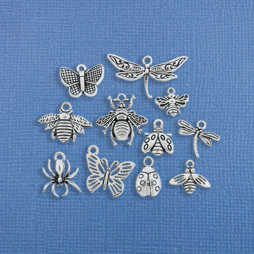 Bug themed collection of antique silver tone charms, in a zinc alloy metal.