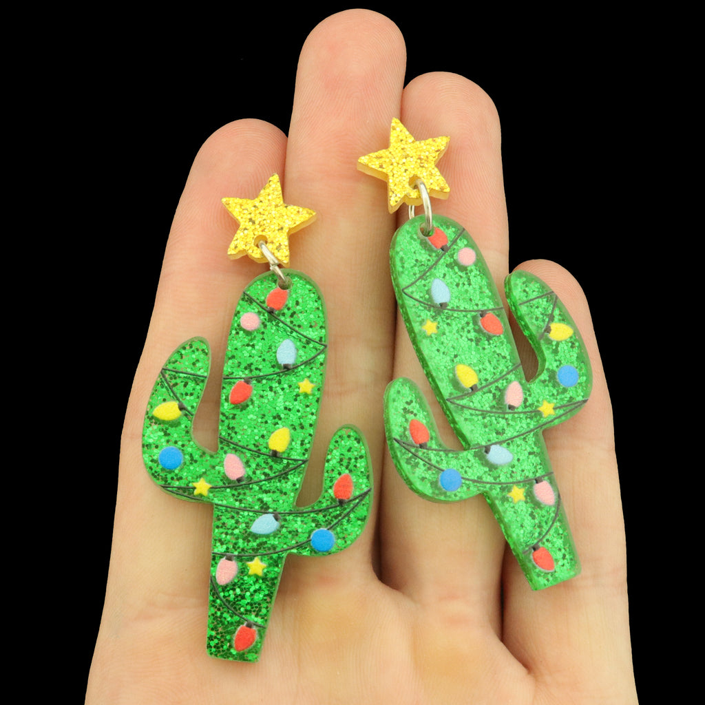 Check out these super cute Christmas Cactus earrings! Made of colorful acrylic and zinc alloy studs, they include Christmas lights and a yellow star... very eye catching!