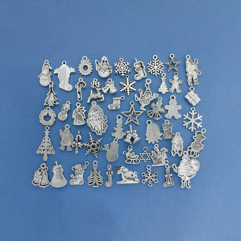 Christmas themed collection of antique silver tone charms, in a zinc alloy metal.