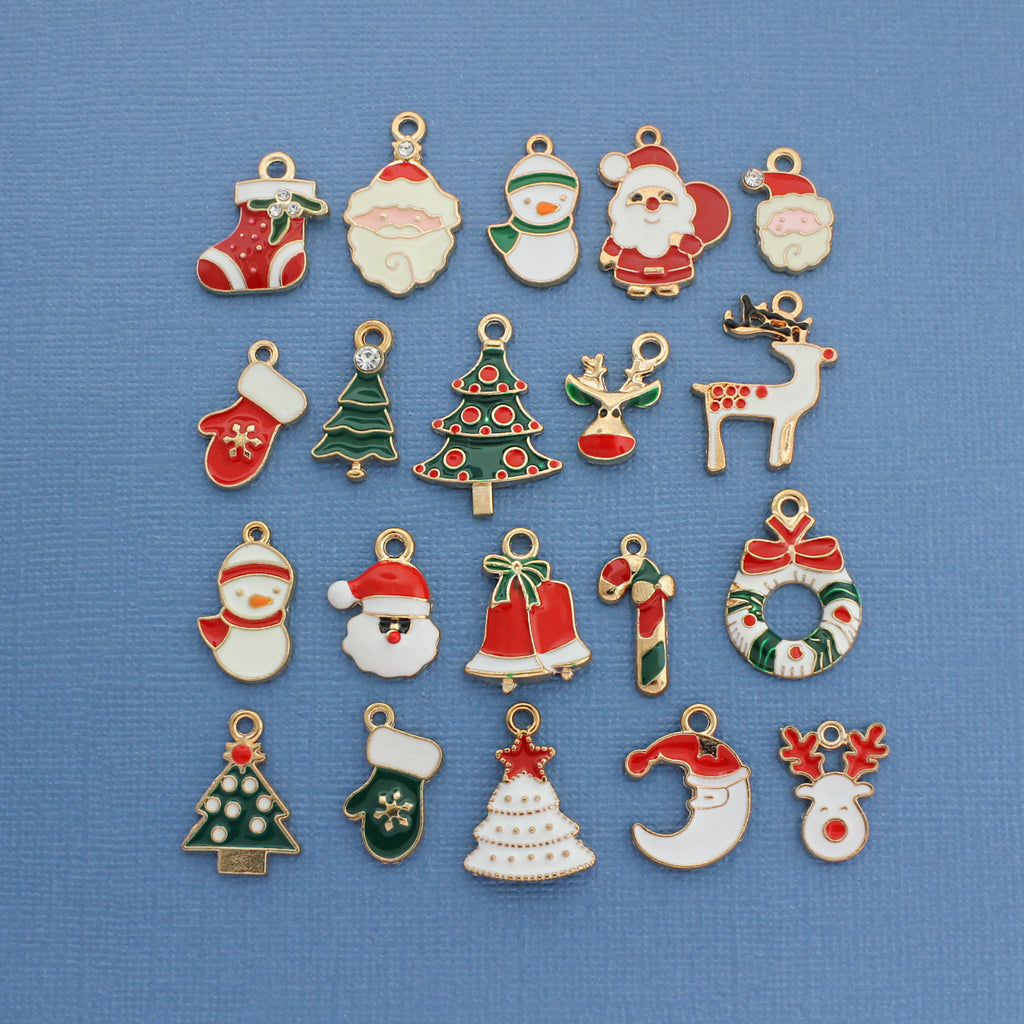 Christmas themed collection of gold tone enamel charms, in a zinc alloy metal.