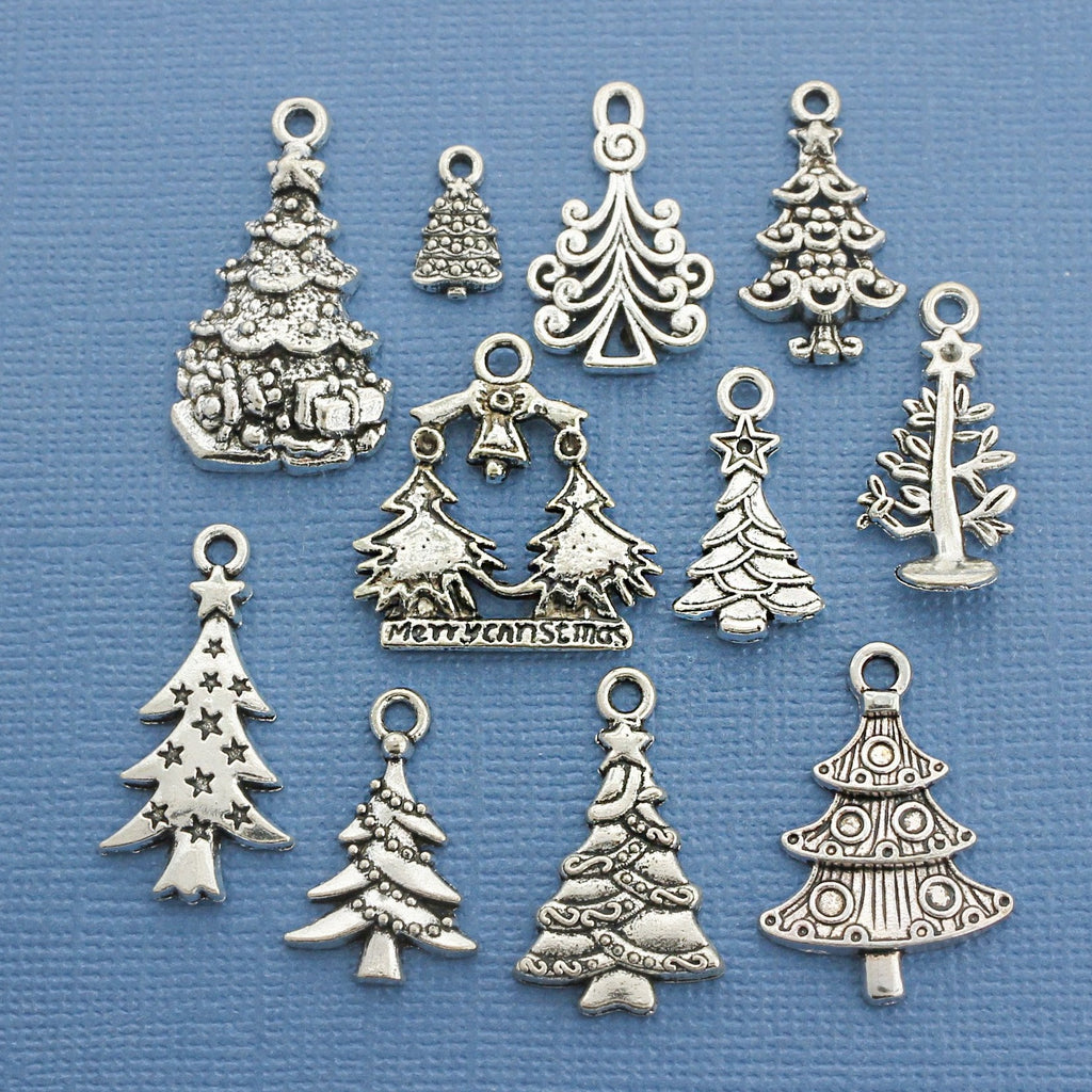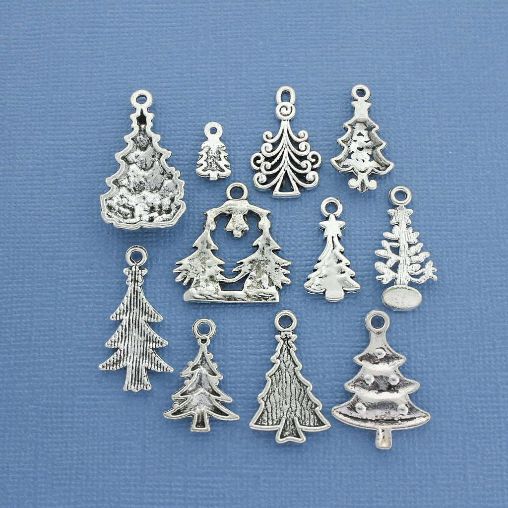 Christmas tree themed collection of antique silver tone charms, in a zinc alloy metal.