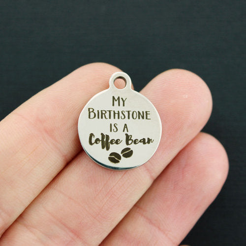 "My birthstone is a coffee bean" laser engraved stainless steel round charms with coffee bean image, from our exclusive line designed by Bohemian Findings.