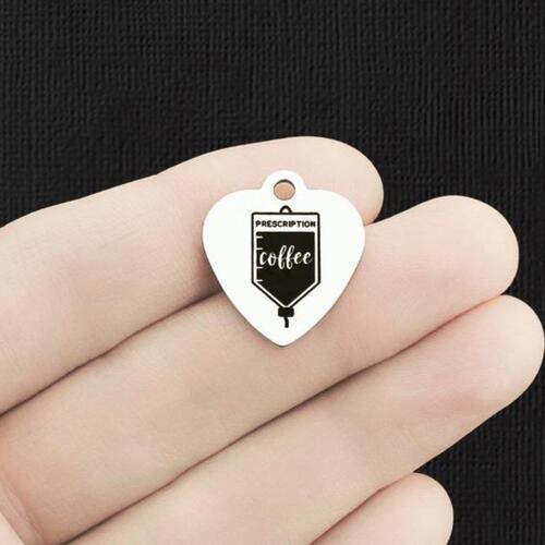 Medical IV with coffee prescription laser engraved stainless steel heart charms, from our exclusive line designed by Bohemian Findings.