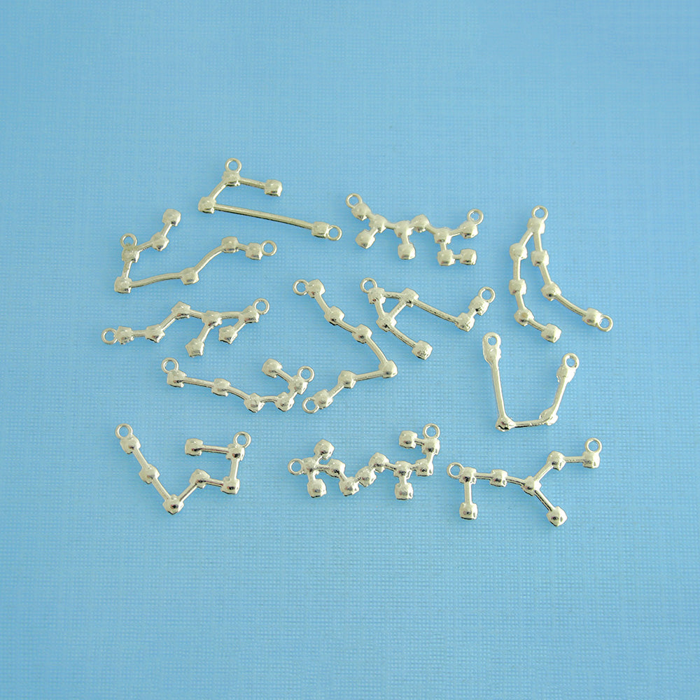 Constellation collection of silver tone connector charms with inset clear rhinestones, in a zinc alloy metal.
