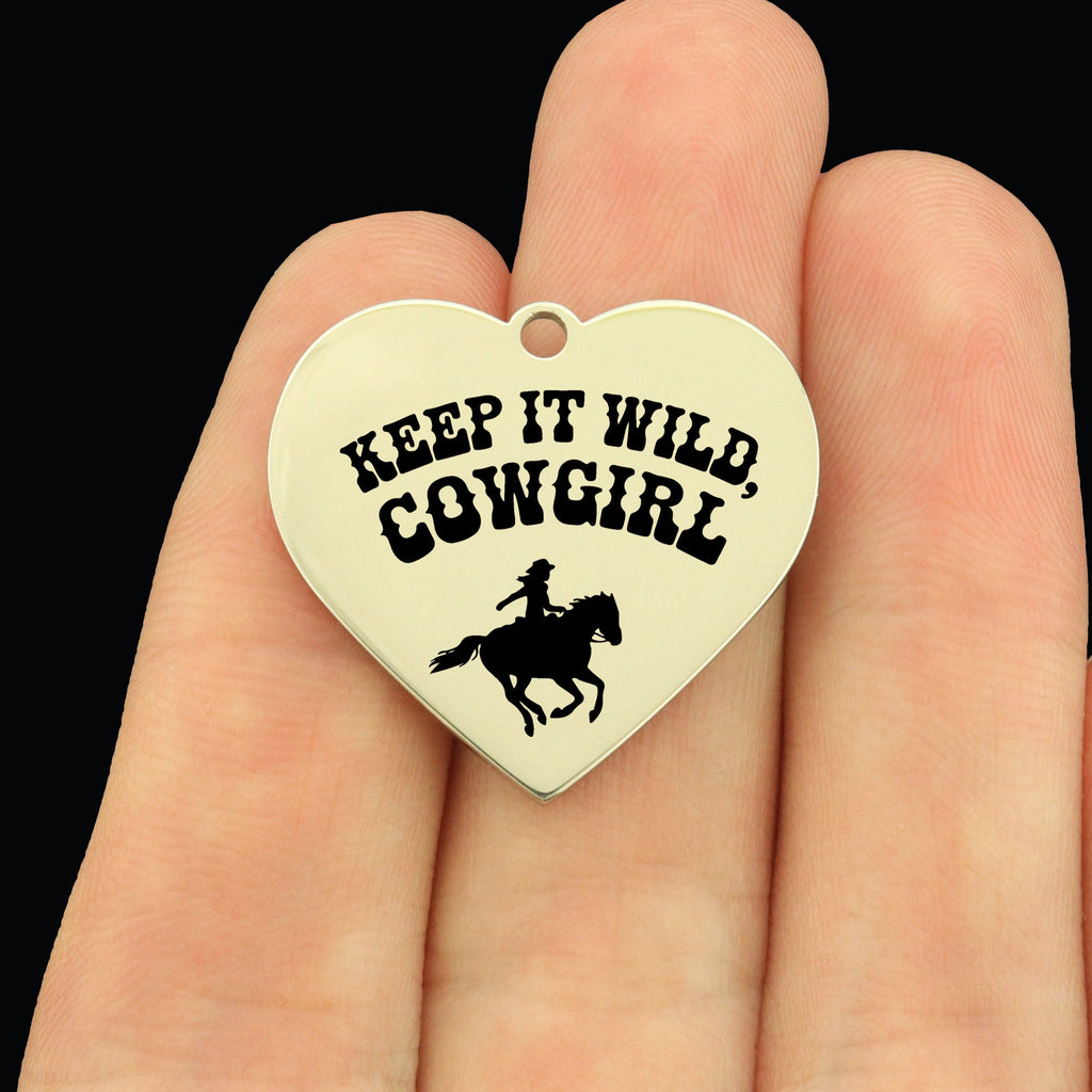 "Keep it wild cowgirl" laser engraved stainless steel round charms with stethoscope image, from our exclusive line designed by Bohemian Findings.