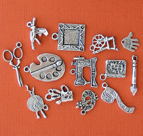 Craft themed collection of antique silver tone charms, in a zinc alloy metal.