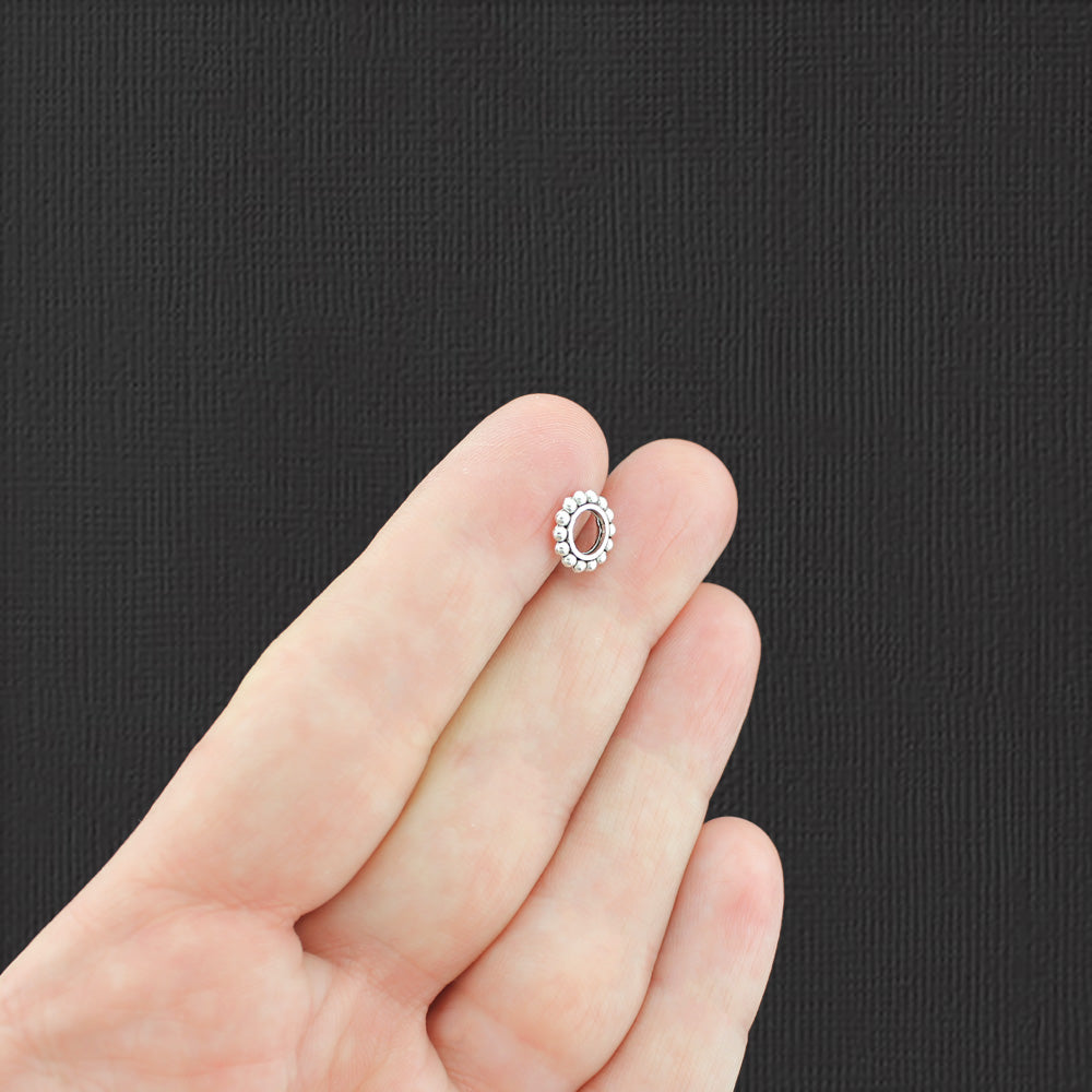 Silver tone metal beads in a 9mm x 2mm daisy spacer, with a metallic finish.
