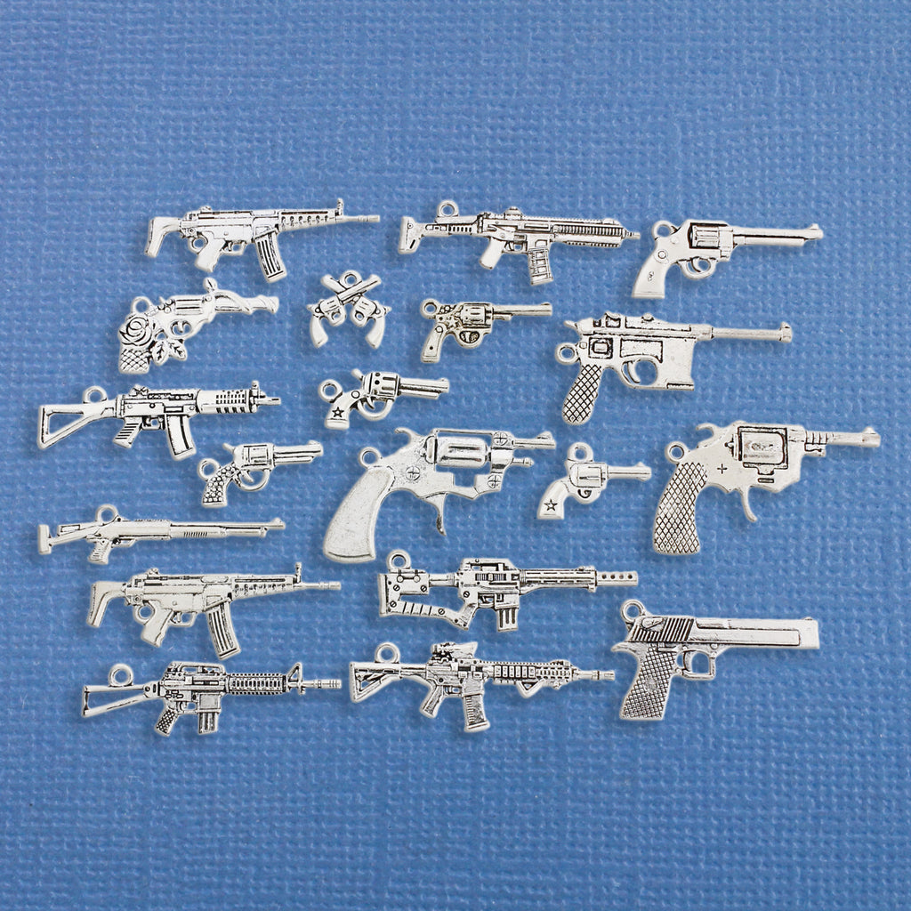 Gun themed collection of antique silver tone charms, in a zinc alloy metal.