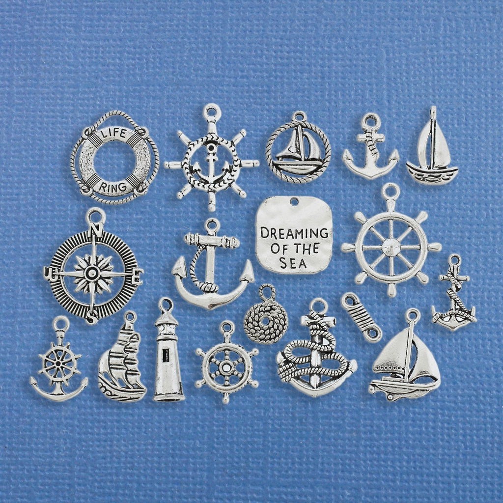 Nautical themed collection of antique silver tone charms, in a zinc alloy metal.