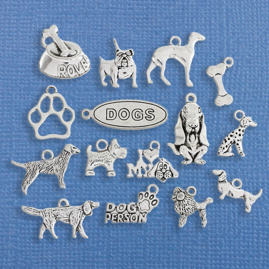 Dog themed collection of antique silver tone charms, in a zinc alloy metal.