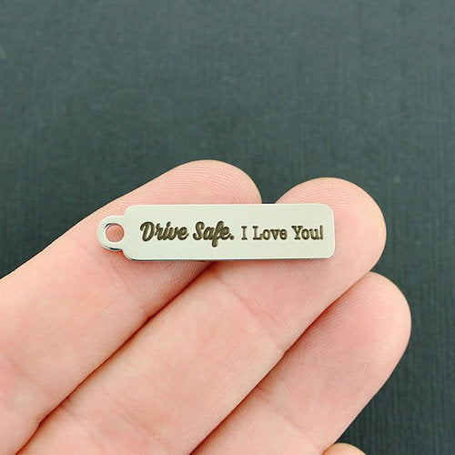 "Drive safe, I love you!" laser engraved stainless steel drop charms, from our exclusive line designed by Bohemian Findings.