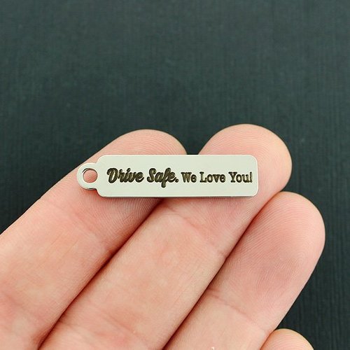 "Drive safe, we love you!" laser engraved stainless steel drop charms, from our exclusive line designed by Bohemian Findings.