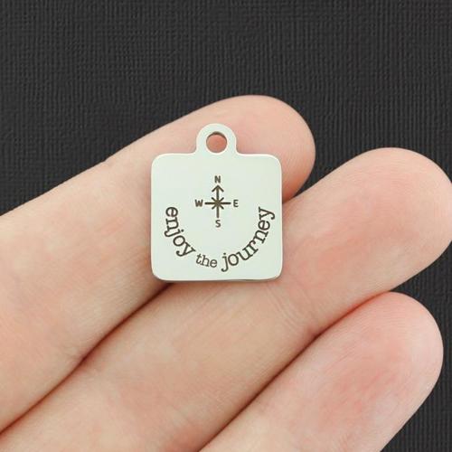 "Enjoy the call" laser engraved stainless steel square charms with compass image, from our exclusive line designed by Bohemian Findings.