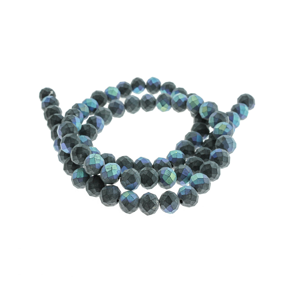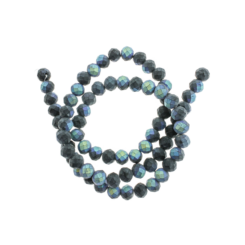 Black faceted glass beads in a 10mm x 7mm faceted rondelle, with an electroplated matte finish.