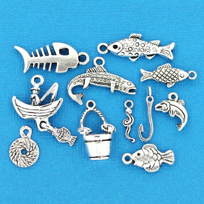Fishing themed collection of antique silver tone charms, in a zinc alloy metal.