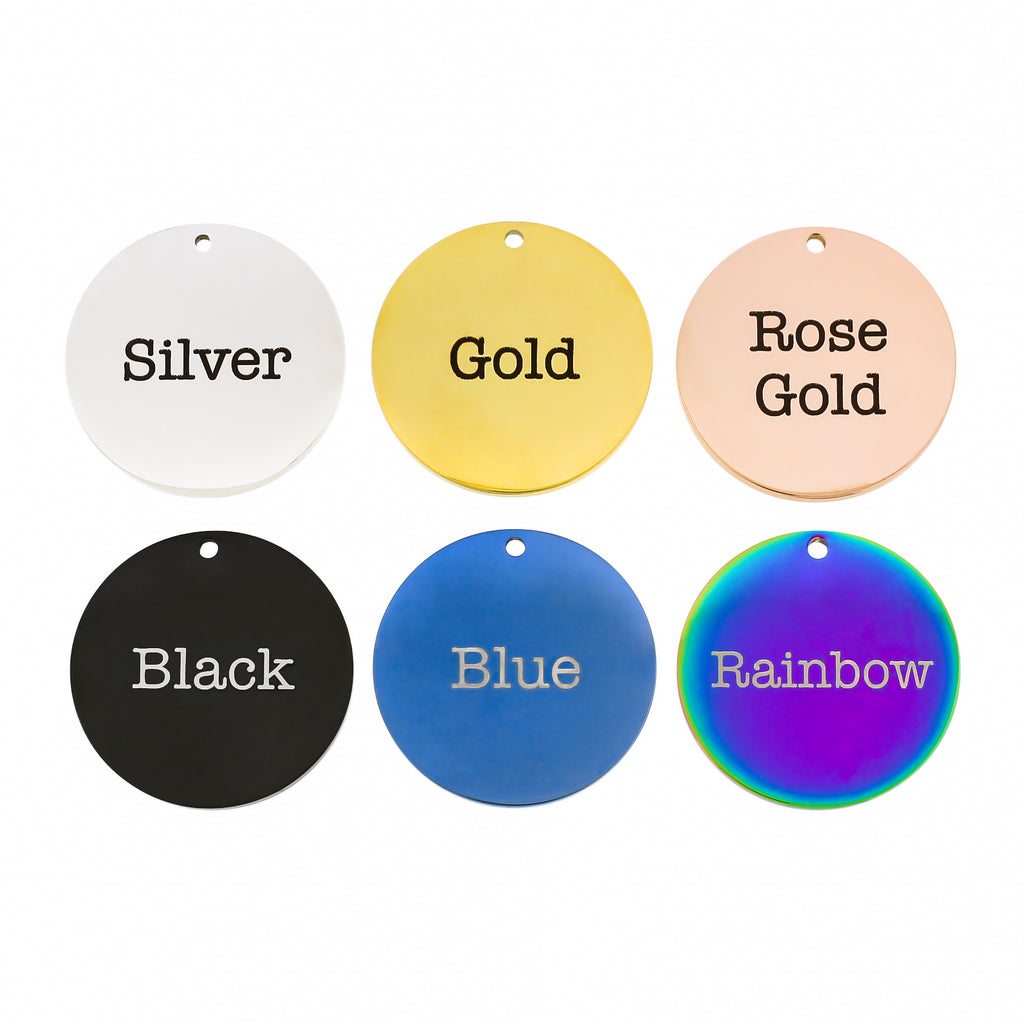 The charms are made from high-quality stainless steel, hand polished on both sides. The gold, rose gold, blue, black, and rainbow finishes are magnetically bonded with colored stainless steel to achieve a durable, permanent plating. All of our charms are hypoallergenic and won't tarnish! The design will not fade, as we don't use any aerosol paints or chemicals in our lasering process. We do all the designing and lasering right here in in our shop!