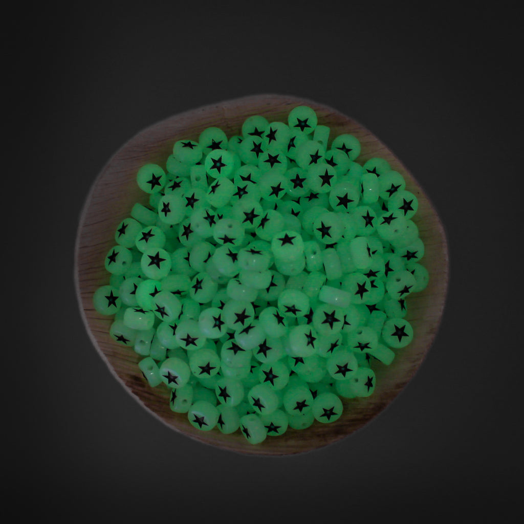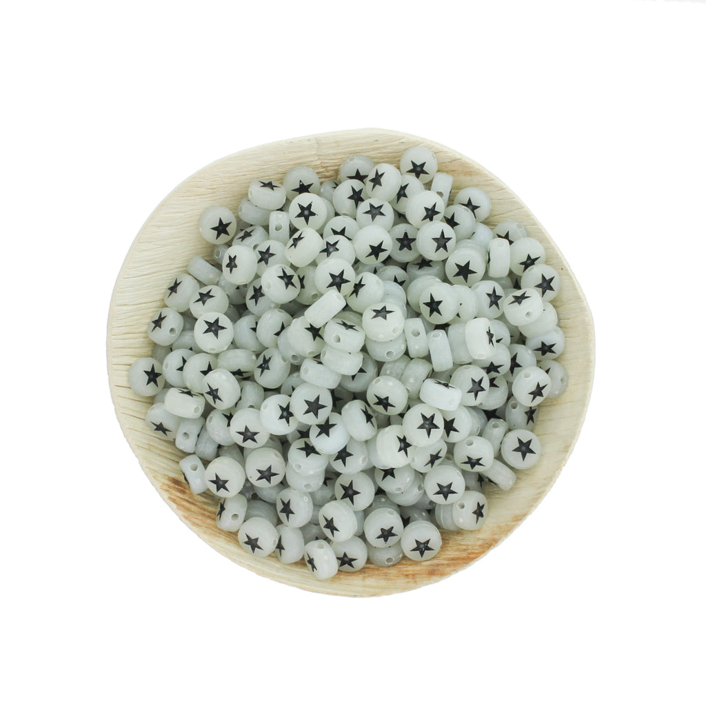 Glow in the dark beads with black stars in a 7mm flat round, with a polished finish.