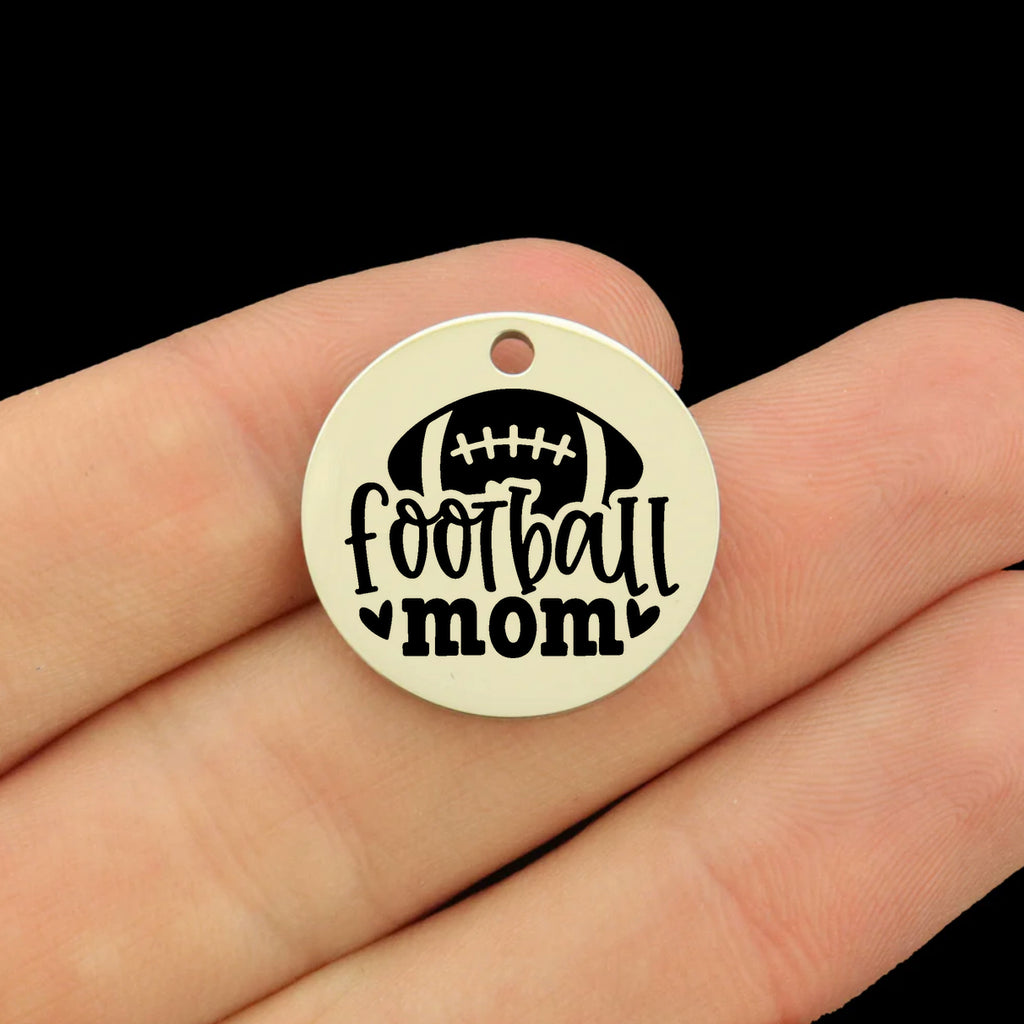 "Football Mom" laser engraved stainless steel round charms, from our exclusive line.
