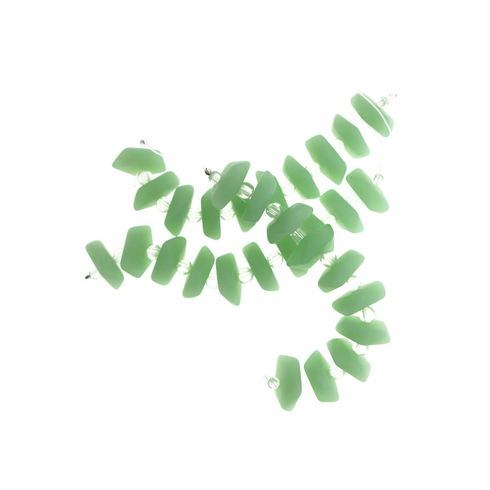 Green cultured sea glass beads in a 14mm freeform button shape, with a matte finish.