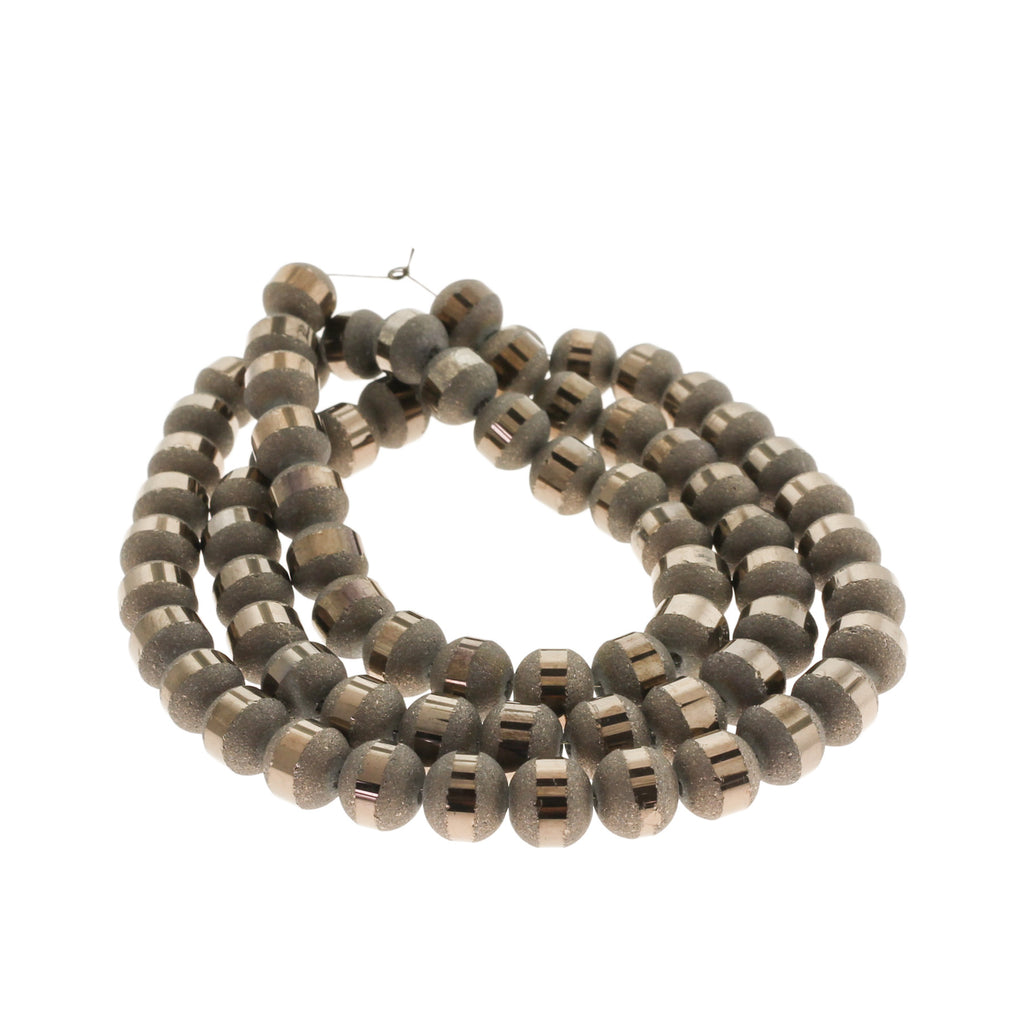 Glass beads in a 8mm round with a frosted and electroplated finish. Available in champagne, brown, peach, silver, blue, white, and copper!