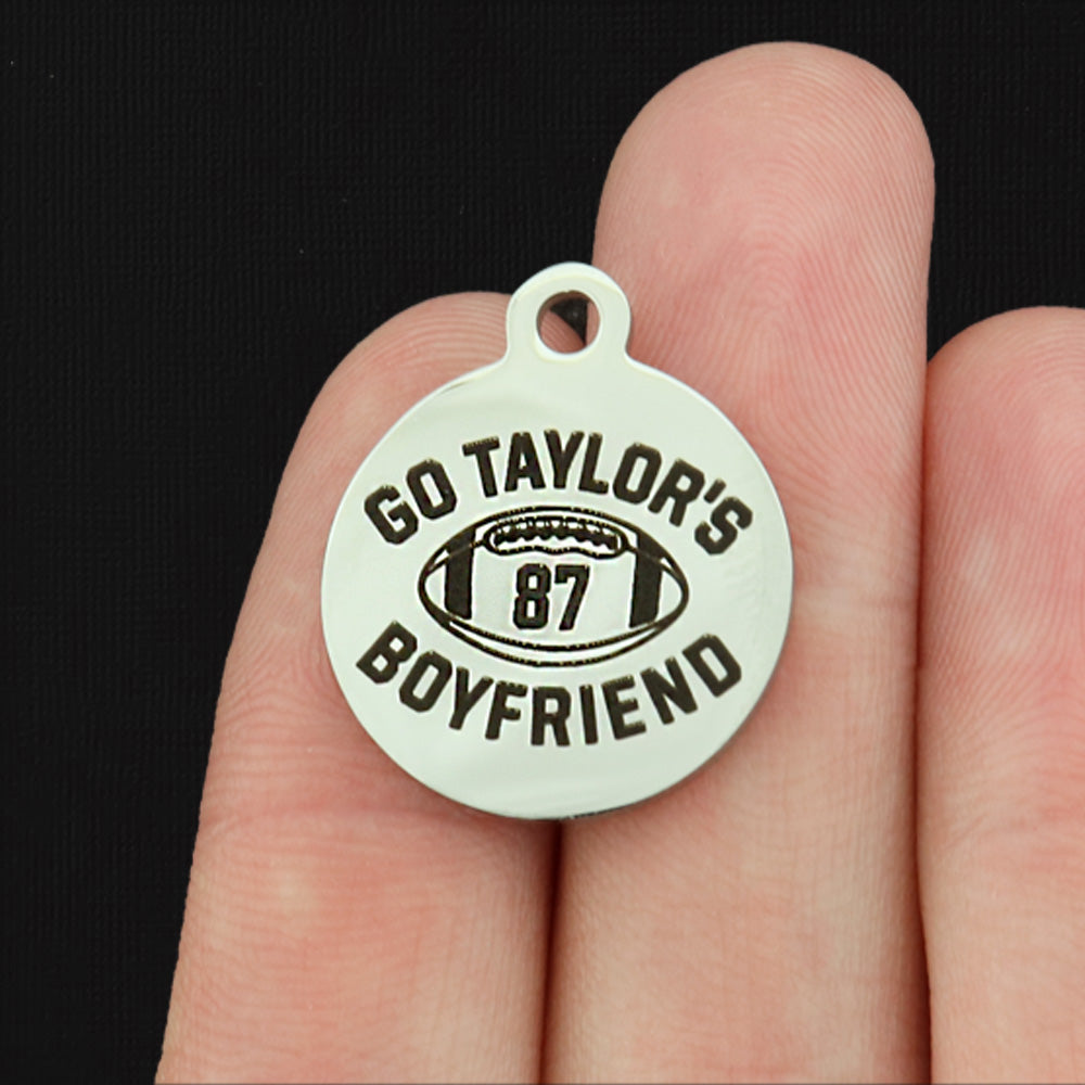 "Go Taylor's Boyfriend" laser engraved stainless steel round charms with football with number 87 image, from our exclusive line designed by Bohemian Findings.