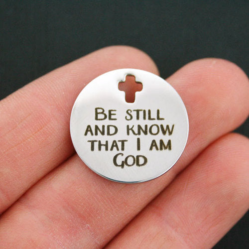 "Be still and know that I am God" laser engraved stainless steel cross cutout round charms, from our exclusive line designed by Bohemian Findings.