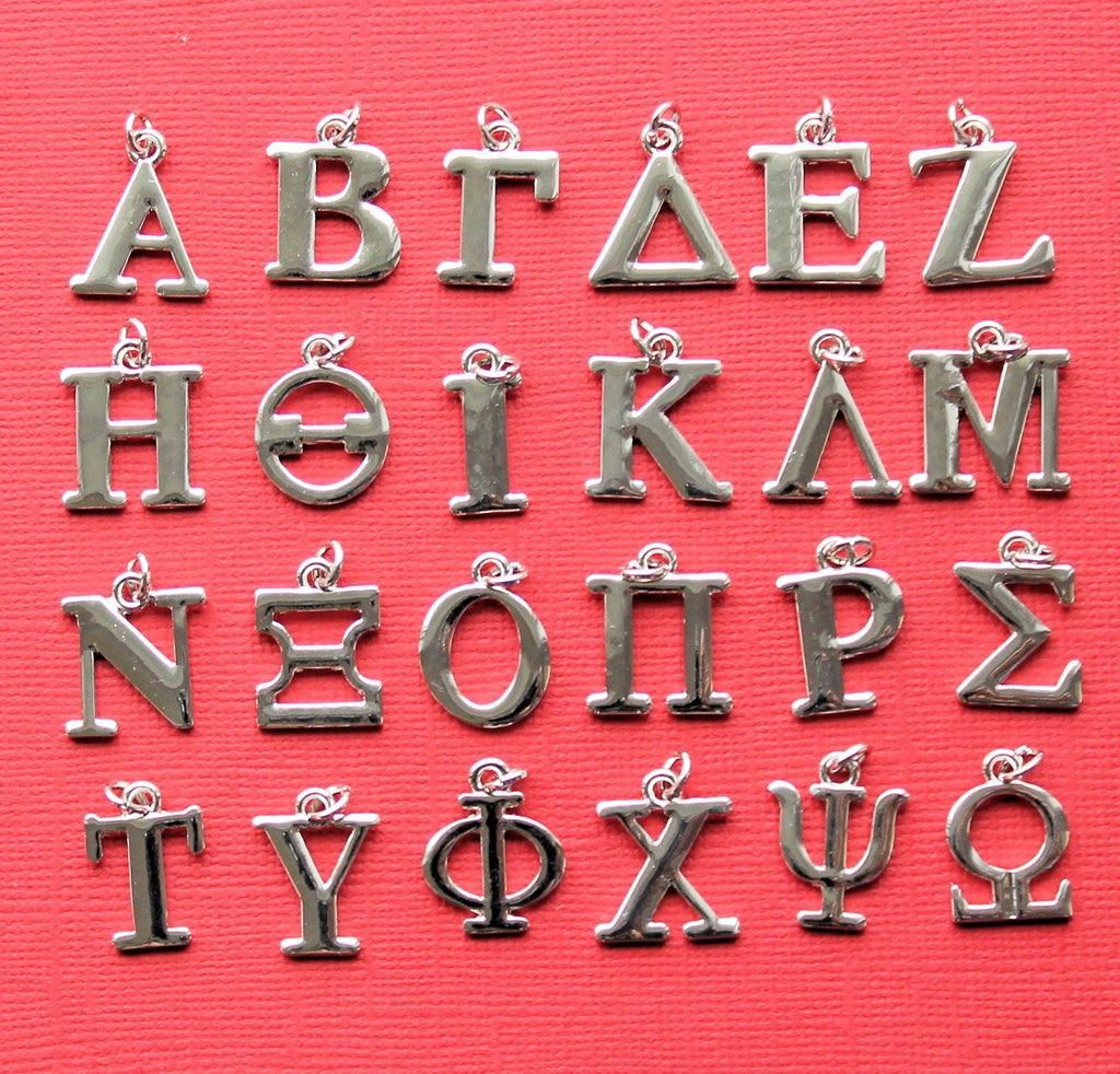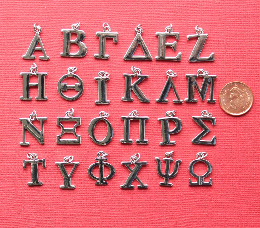 Greek alphabet silver tone charms, in a zinc alloy metal.