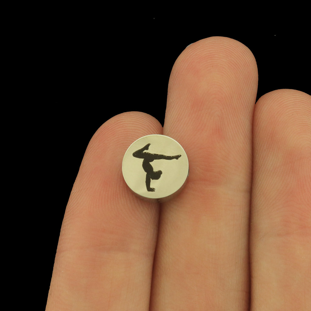 Gymnast laser engraved stainless steel beads. Choose from three sizes - 6mm, 8mm, or 10mm! Perfect to add a personalized touch to a beaded bracelet.
