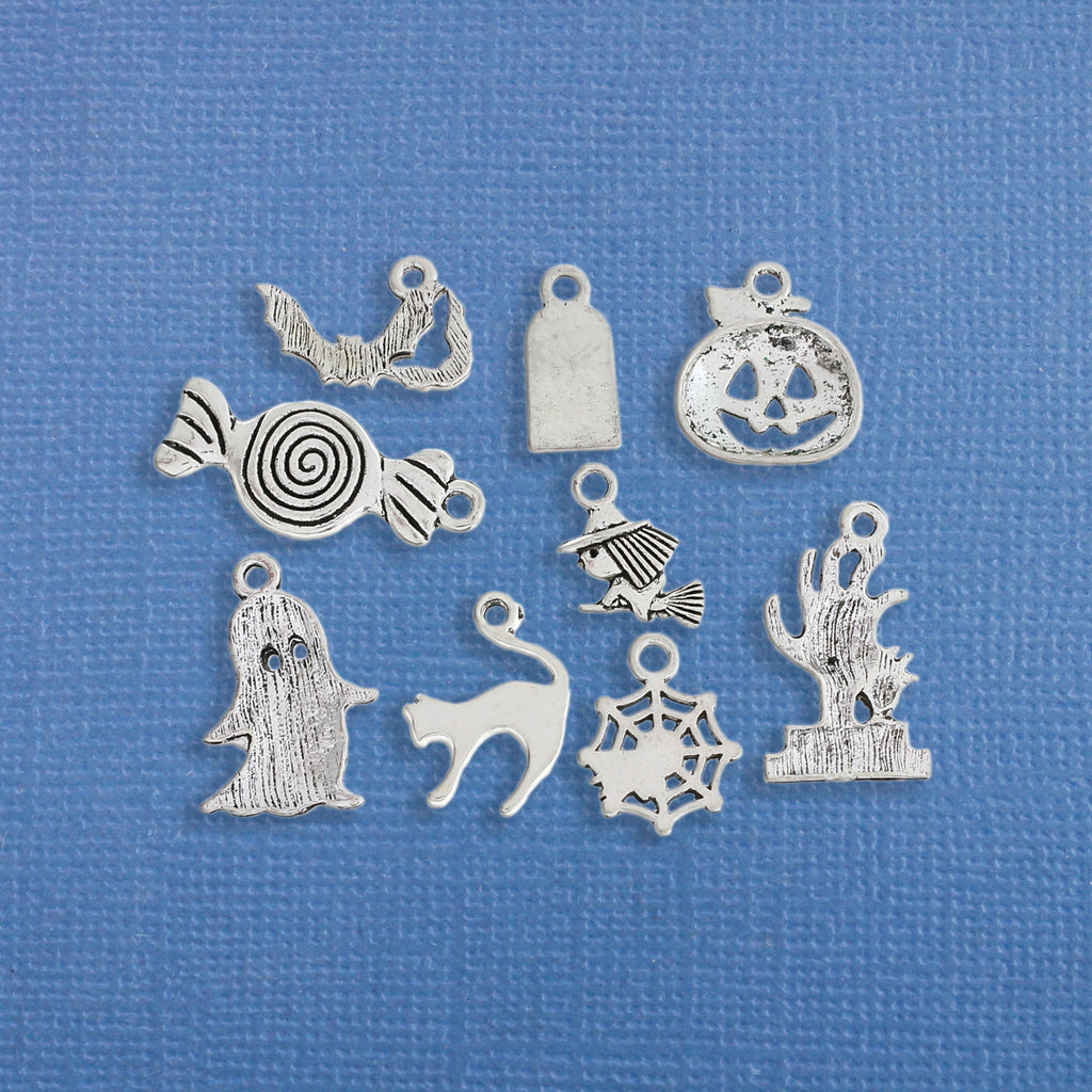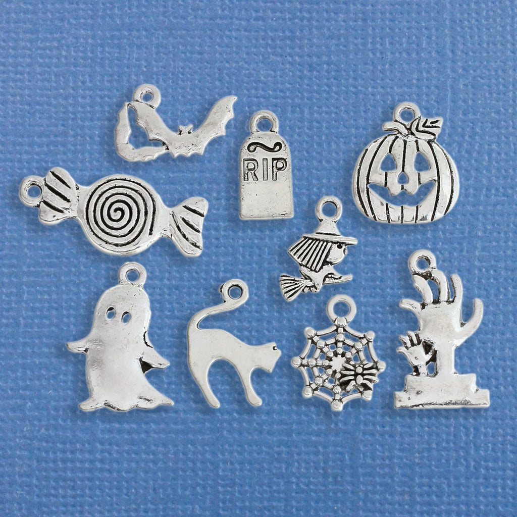 Halloween themed collection of antique silver tone charms, in a zinc alloy metal.