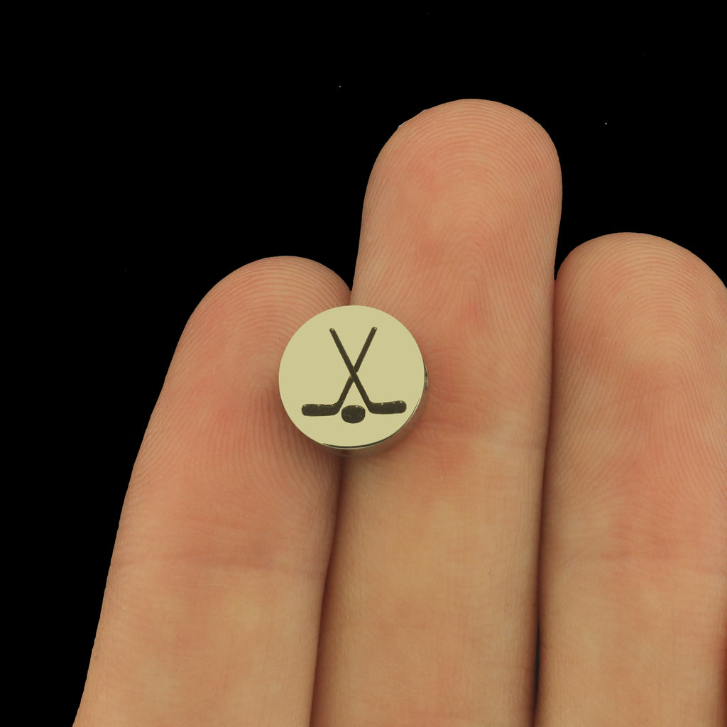 Hockey sticks laser engraved stainless steel beads. Choose from three sizes - 6mm, 8mm, or 10mm! Perfect to add a personalized touch to a beaded bracelet.