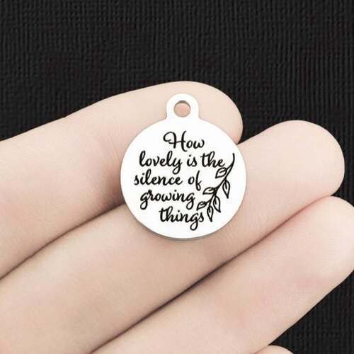 "How lovely is the silence of growing things" laser engraved stainless steel round charms with leaf image, from our exclusive line designed by Bohemian Findings.